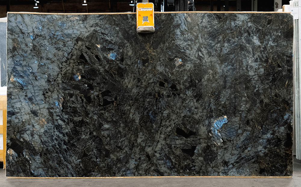 Lemurian Blue Granite is a breathtaking natural stone from Madagascar, renowned for its iridescent blue and green flashes that shimmer across a deep black background. This exotic granite features labradorite crystals that create a mesmerizing play of color and light—almost like looking into the surface of a gemstone or the depths of the ocean. Each slab is truly one-of-a-kind, with vibrant patches of turquoise, silver, and gold reflecting differently depending on the lighting. Lemurian Blue is a statement piece often used for feature walls, kitchen islands, or bar tops where its striking beauty can truly shine. Luxurious, bold, and endlessly fascinating, it brings a sense of drama and elegance to any design.